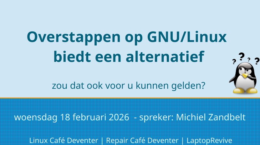 We zien uit naar het volgende Linux Café op zaterdag 21 februari . Dit wordt voorafgegaan door een speciale informatie avond op woensdag 18 februari a.s. in de bibliotheek. Organisatie is in handen van Linux Café Deventer i.s.m. LaptopRevive en Repair Café Deventer. Er zullen twee presentaties zijn gevolgd door enkele workshops om zelf met linux aan de slag te gaan. Nadere berichtgeving hierover volgt.